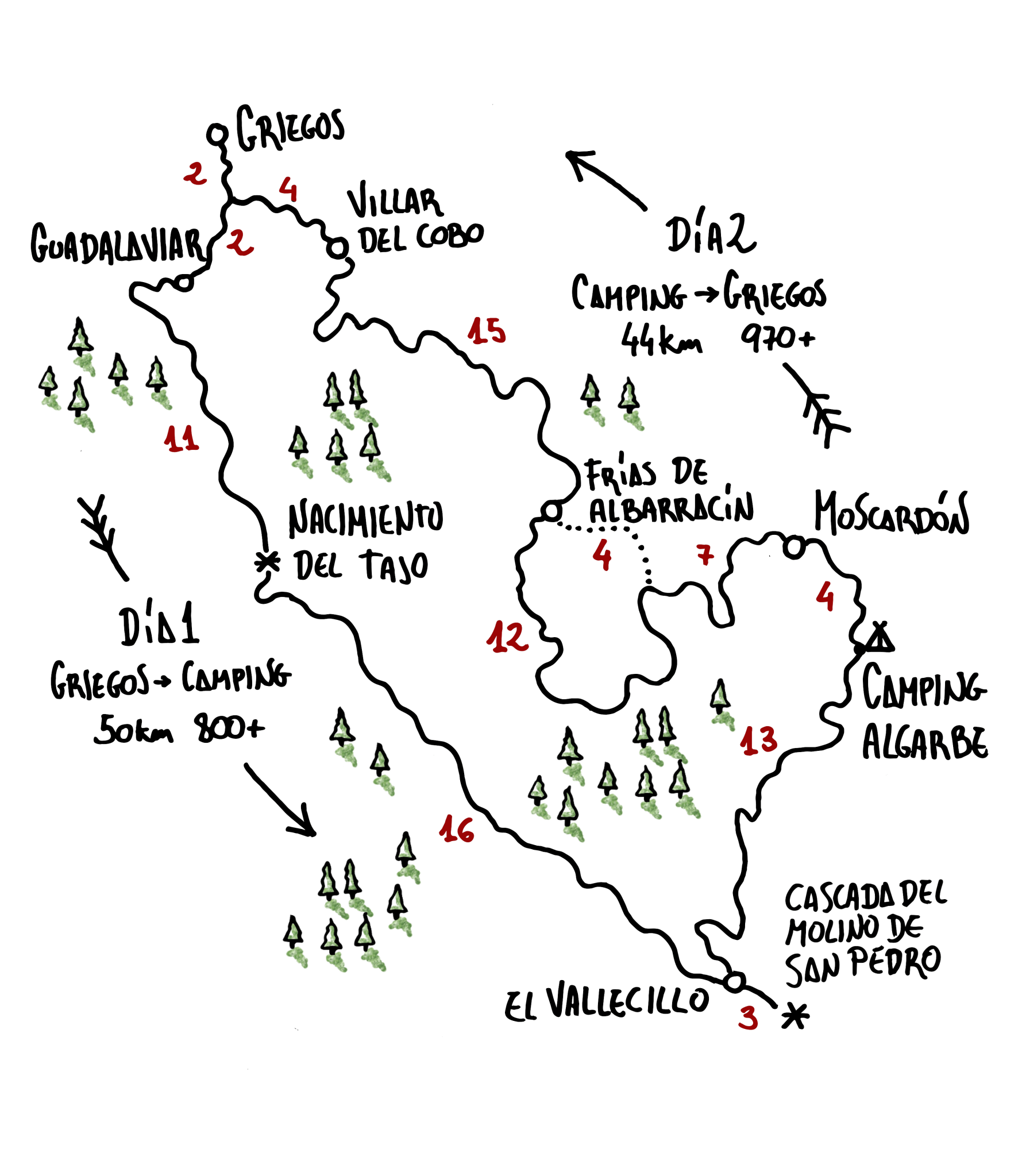 The route, just over 50 km long, would take us from Griegos to Terriente, where we would spend the night at the beautiful Algarbe campsite, one of the most integrated into the environment of all those I know. The weather still allowed it, so halfway along the route a few brave people took a dip in the icy waters of the Cabriel river, at the waterfall of Molino de San Pedro (El Vallecillo).
