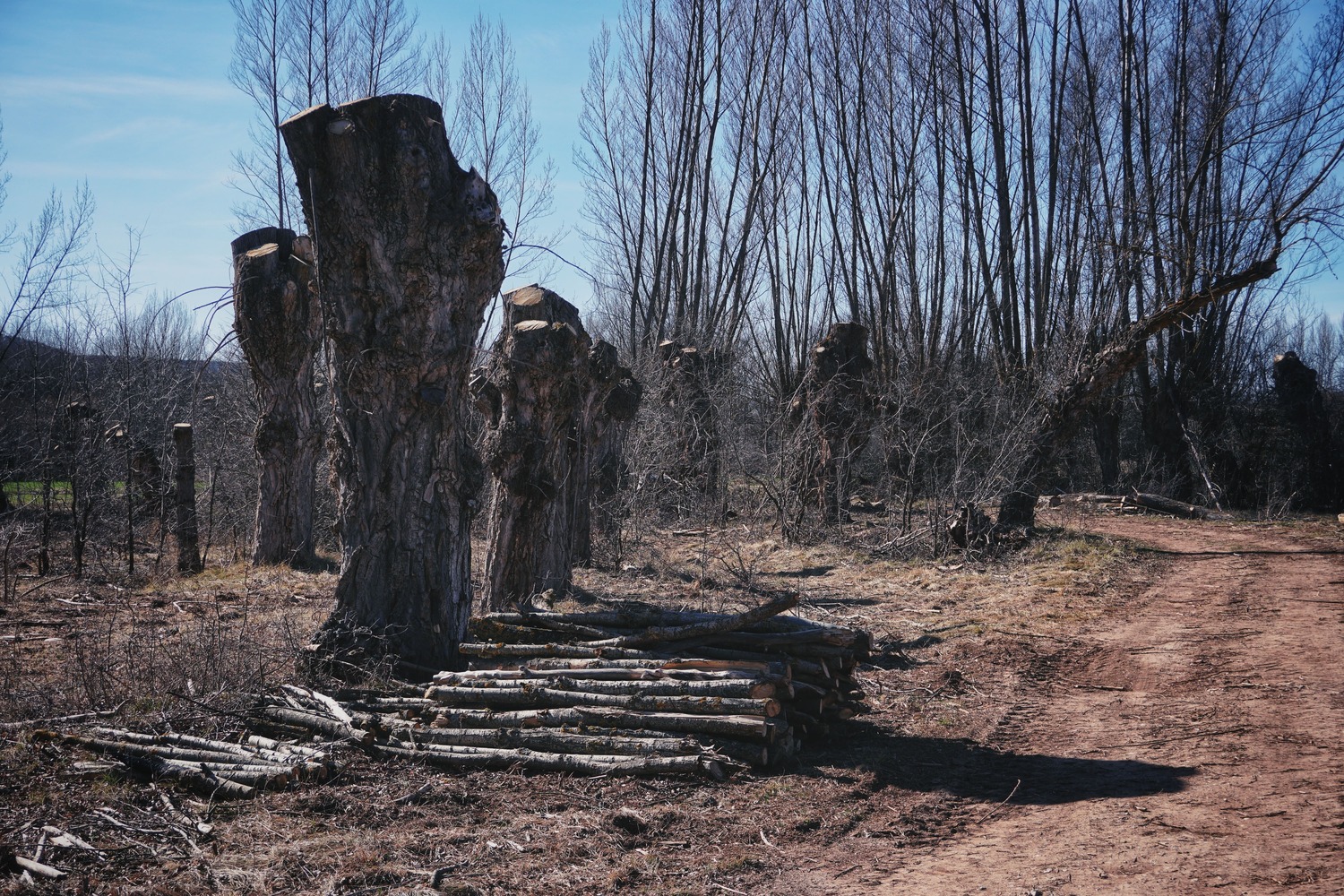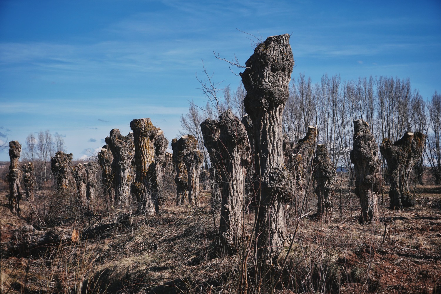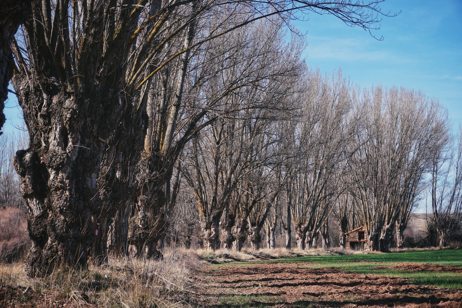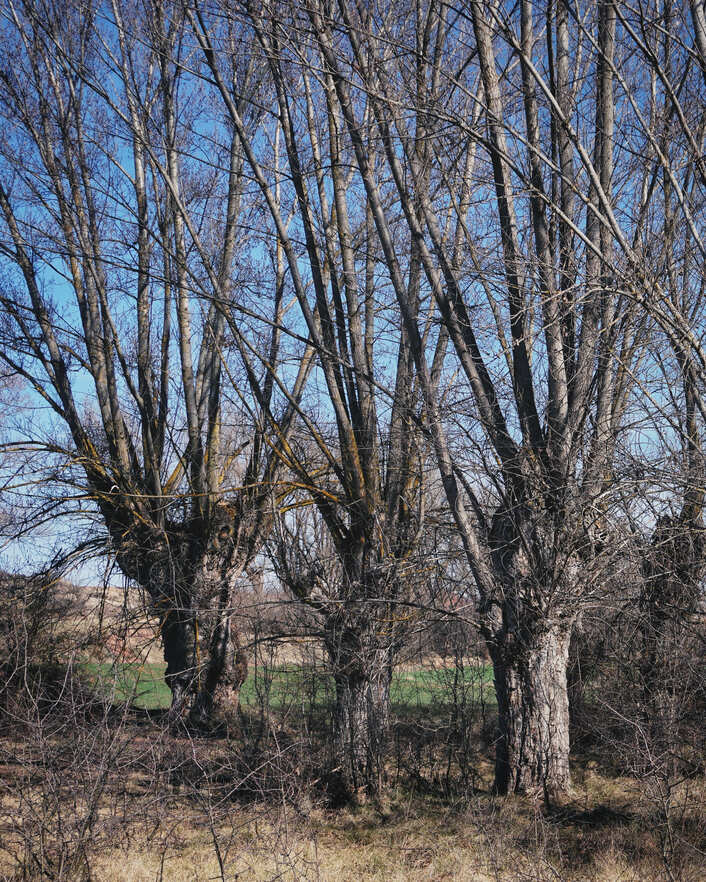 Los Chopos Cabeceros. Dejamos Jorcas atrás y nos reencontramos de nuevo con el Río Alfambra. Durante unos kilómetros, los protagonistas son estos árboles. Se trata de álamos negros que de una forma tradicional, desde hace generaciones, son podados periódicamente a una altura determinada, fuera del alcance del ganado, para su aprovechamiento como madera, combustible o forraje. Son parte de la identidad de estos pueblos y símbolo de su paisaje. Encierran una enorme riqueza cultural, ecológica y paisajística que debe ser cuidada y conservada, por tratarse de una concentración única en Europa de este tipo de árbol.