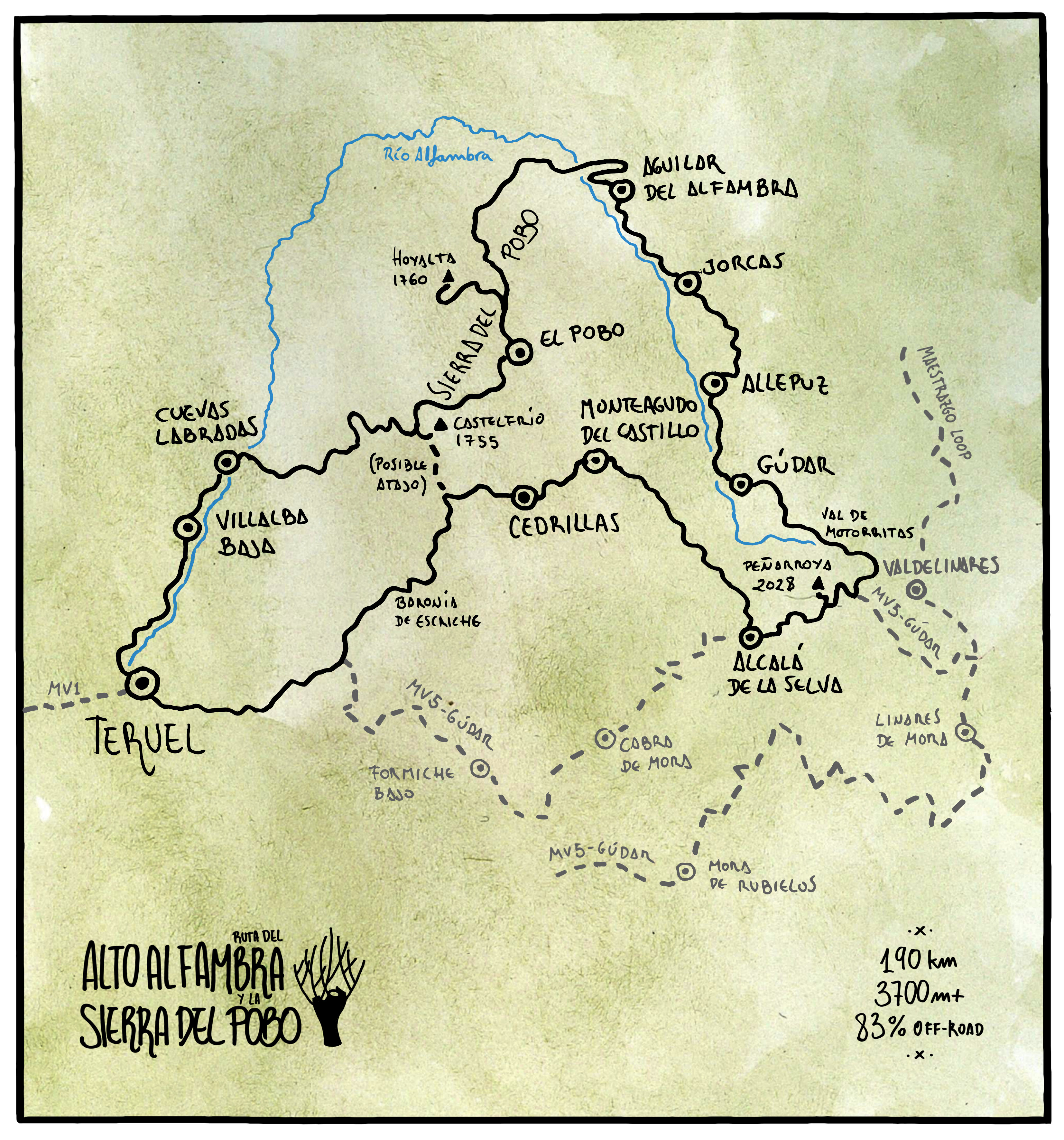 En el mapa puede apreciarse la forma en la que esta ruta enlaza con MV1, MV5, con el Maestrazgo Loop, y un posible atajo.