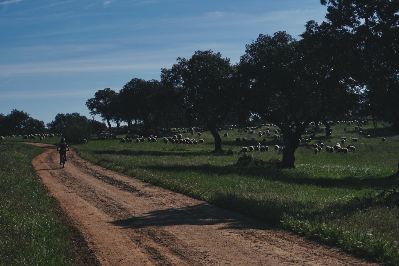 Pedaleando por estas dehesas en las que pastan cerdos, ovejas y vacas, observamos una forma muy diferente de gestión ganadera a la que estamos acostumbrados en nuestras zonas. No entro en el debate sobre sus ventajas o inconvenientes, sobre si es mejor o peor, no es este el lugar para ello, por muy interesante que pudiera parecerme una larga conversación para poder aprender un poco más sobre estos temas…